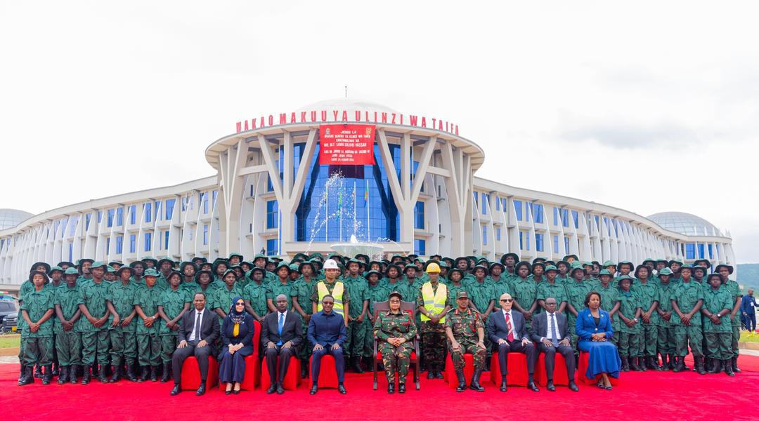Rais wa Jamhuri ya Muungano wa Tanzania na Amiri Jeshi Mkuu, Mhe. Dkt. Samia Suluhu Hassan akiwa na viongozi mbalimbali kwenye picha ya pamoja na baadhi ya Maafisa na Askari wa Kikosi Kazi kutoka Jeshi la Wananchi wa Tanzania (JWTZ) walioshiriki Ujenzi wa Makao Makuu ya Ulinzi wa Taifa (MMUT), Kikombo Mkoani Dodoma tarehe 24 Februari, 2026